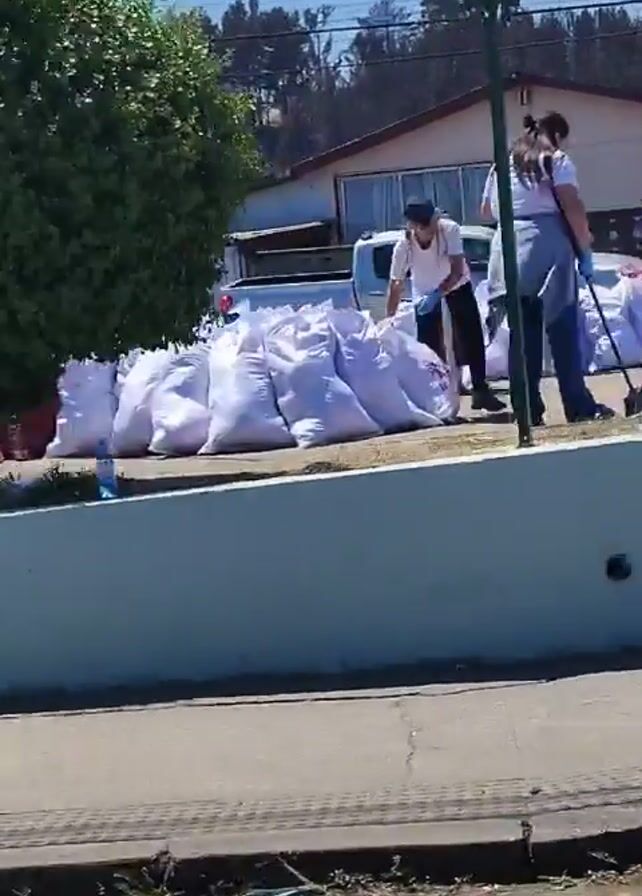 sunny outdoor scene with people sorting through piles of donations on a raised platform. The donations appear to consist of clothing, blankets, and other goods, packed in large white bags and cardboard boxes. A white van with "PDI" markings is visible in the background, along with a blue tent. People are seen organizing and moving the donated items. A wooden bench sits near a tree on the platform, where two people are sitting together. The location appears to be a public area, possibly a park or community space. The camera pans across the scene, capturing the extent of the donation effort and the presence of volunteers and support vehicles.