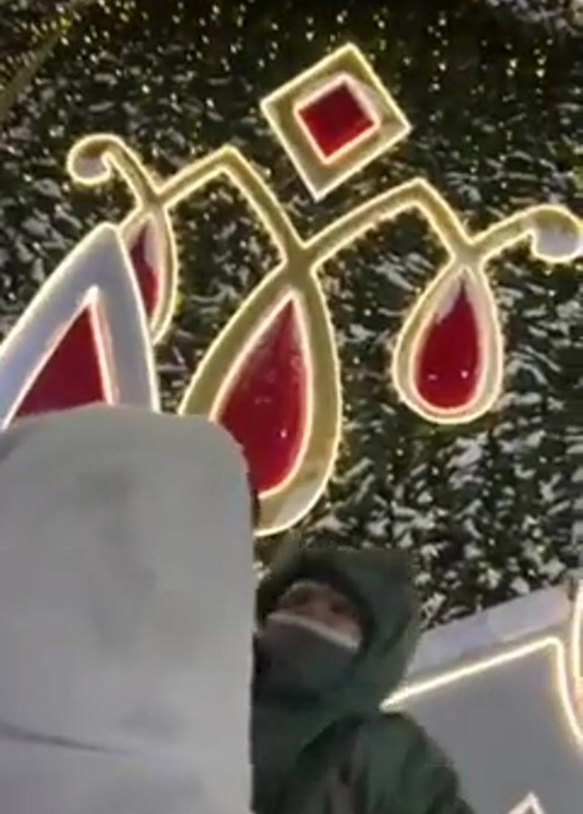 Two people, a child and an adult, are having a playful fight in the snow near a Christmas decoration. The adult is wearing a white hooded jacket and the child is wearing a dark green snowsuit with the hood up and a face covering. The child throws snow at the adult. The Christmas decoration behind them is a large, festive design with lights and red accents. The ground is covered in snow, suggesting it is cold outside. The scene is lively and fun, indicative of a winter holiday activity.