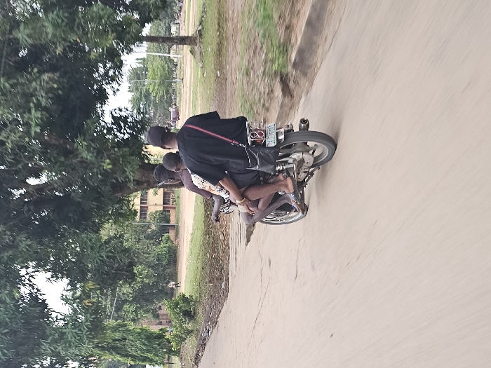 Three people ride a motorcycle on a paved road. The rider wears black clothing. Trees line the side of the road, along with some grass. In the background is a light-colored building. The motorcycle has a license plate on the back. The image appears to be taken from a moving vehicle.