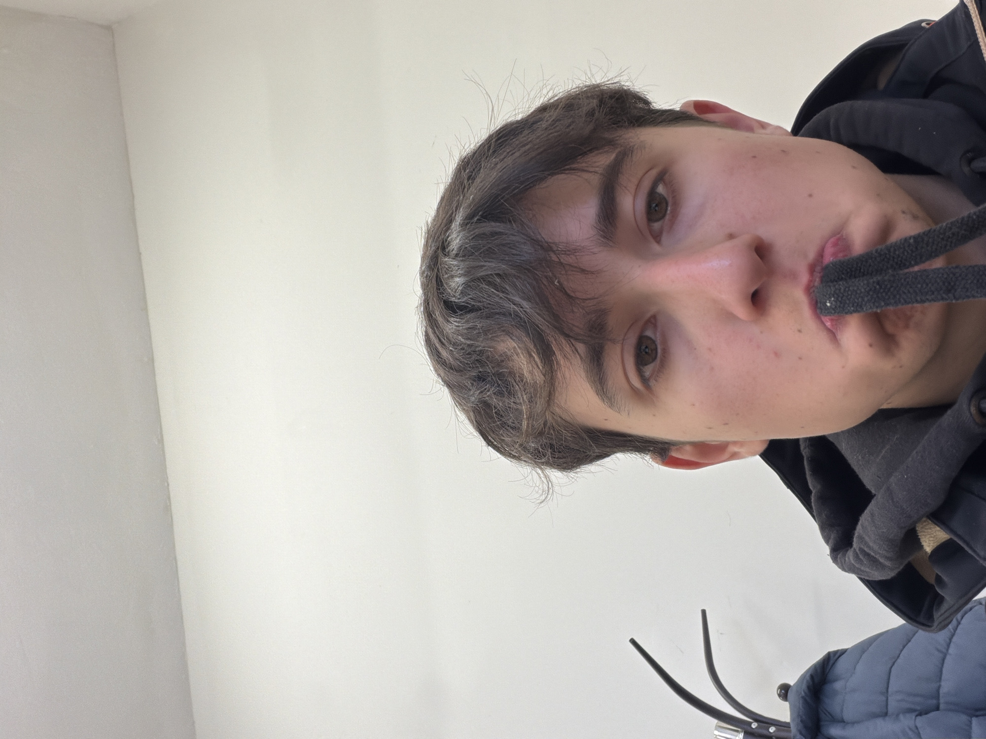 A close-up, slightly angled, and vertically-oriented photograph features a young person indoors. The individual, presumably a male, has short, dark hair, light skin, and brown eyes. He is wearing a dark hooded jacket. The drawstring of the hood is in his mouth. Behind the subject, a plain white wall is visible. A portion of a coat rack and blue jacket can be seen at the bottom right corner. The location and city of Sofia, Bulgaria cannot be determined.