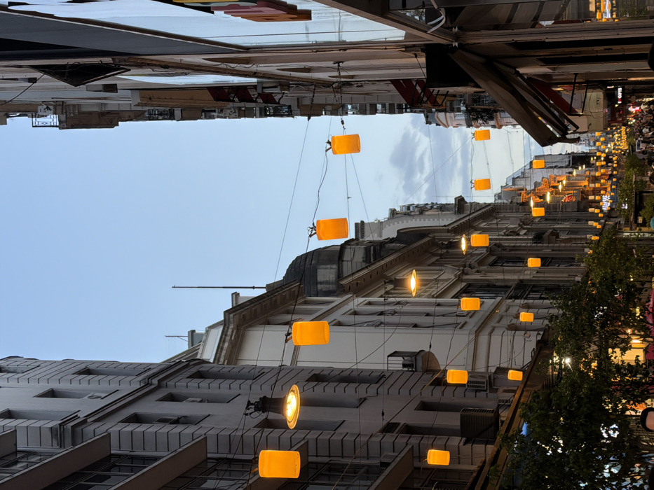 Buildings line a street decorated with illuminated, orange rectangular lanterns suspended by wires. The lanterns are arranged in rows, creating a festive atmosphere. The structures are diverse, with varying heights and architectural details. Some buildings have ornate facades, while others are more modern. A mix of natural daylight and the glow from the lights illuminate the scene. The angle of the shot is unique, offering a perspective that emphasizes the verticality of the buildings.