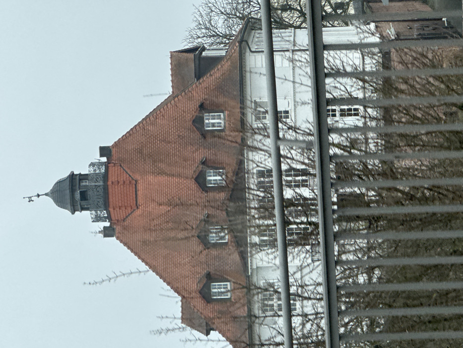 The image presents a forensic view of the Kehl City Hall (Rathaus Kehl) in Kehl, Germany, under an overcast sky. The primary subject is the multi-story building, characterized by a prominent, steeply pitched roof covered in reddish-orange tiles. A dark, possibly hexagonal, cupola with an ornate metal balustrade rises centrally from the main roof, topped by a smaller dome and a weathervane. Four white-framed dormer windows are visible along the front slope of the main roof. The building's facade is white, featuring numerous rectangular multi-pane windows, with some upper-floor windows equipped with small dark-railed balconies. Bare deciduous trees with intricate branch patterns are positioned in the midground, partially obscuring the building's lower and central sections. A grey metal railing, composed of two horizontal bars and multiple vertical balusters, traverses the lower foreground, further limiting the view of the building's ground level. No individuals, specific actions, or discernible interactions are present in the scene.