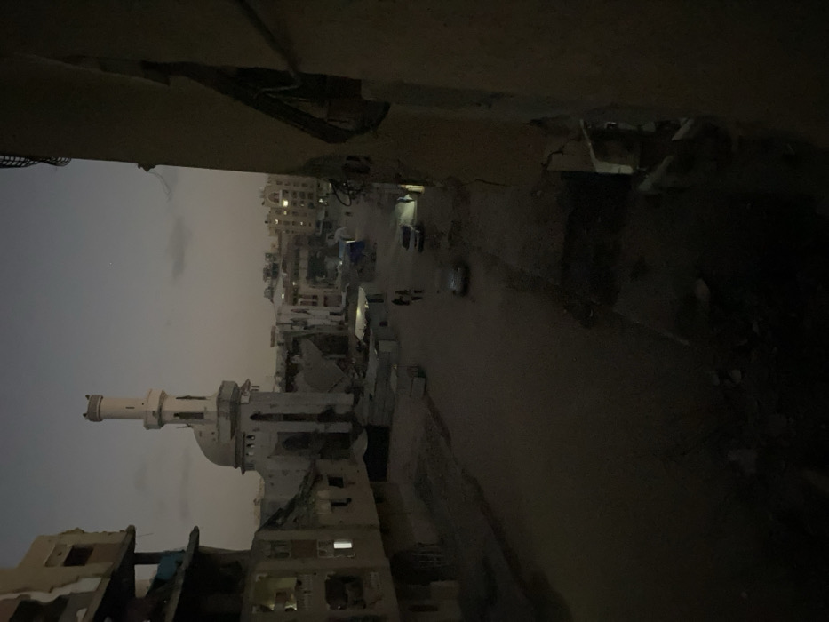 The image captures a street scene in al-Qarara, Palestinian Territory, during dusk or early night, characterized by low light conditions. The perspective is from a damaged structure on the right, exhibiting a large vertical crack and exposed conduits. To the left, a multi-story building appears significantly damaged, with sections of its facade missing, exposed internal elements, and one illuminated window. A wide, unpaved or dirt road occupies the center, showing debris. On this street, three individuals are observed walking, two grouped together, and one further ahead near parked vehicles. Two light-colored cars are parked on the right side of the road; one displays illuminated headlights. Along the left side of the street, several temporary structures with corrugated metal roofs are visible. In the midground, a prominent mosque with a tall minaret and a dome stands, showing signs of structural damage. The background reveals additional damaged urban buildings under a hazy, dusky sky, with a single faint light source visible.