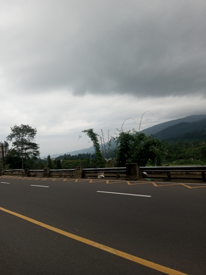 The image displays an outdoor scene in Gubbisamamidi, India, under a heavily overcast sky. A dark asphalt road with a solid yellow line on the left edge and a broken white line in the center occupies the foreground. Above the road, a metal guardrail supported by concrete posts extends horizontally. Behind the guardrail, a dense band of green vegetation is visible, including a prominent conifer tree on the left and several tall, curved bamboo-like stalks. In the background, undulating green mountains rise under a dark grey cloud ceiling. No people or active subjects are present in the frame.