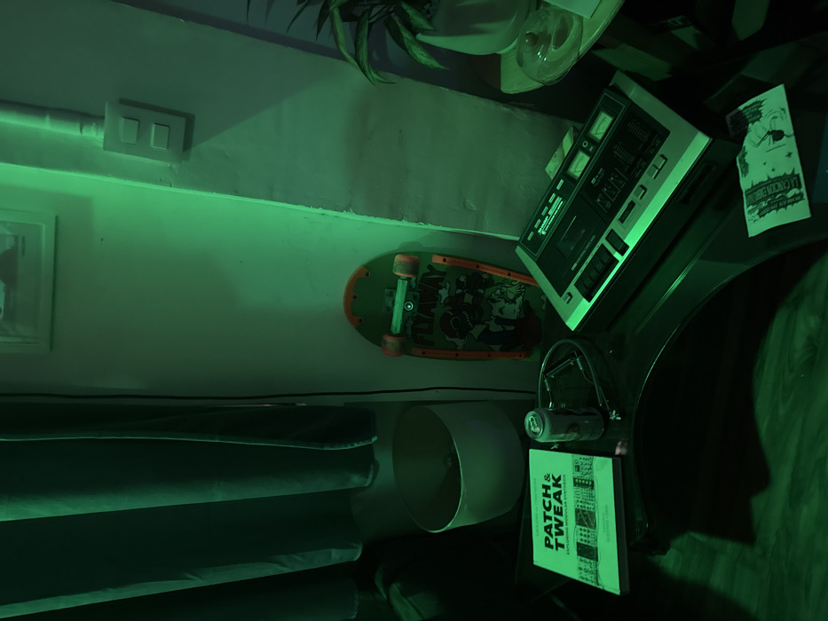 The image depicts an interior scene, illuminated predominantly by a green light source, casting a monochromatic hue over the objects. The precise location within Mexico City is not identifiable from the visual content. In the foreground, a dark, reflective surface, likely a table or desk, holds several items. On the left side of this surface rests an open white book titled "PATCH & TWEAK - EXPLORING MODULAR SYNTHESIS." To its right is a silver beverage can with some colored branding, and coiled audio cables with 1/4-inch jack connectors. Further right, a silver-colored stereo component, possibly a cassette deck, with multiple buttons, controls, and two illuminated VU meters, is positioned. A piece of crumpled paper with text and an image lies on the surface in the bottom right corner. Behind the dark surface, against a light-colored wall, a green skateboard with orange wheels and "FLYAWAY" branding, along with graphics, leans upright. To the left of the skateboard, a white cylindrical object, possibly a waste bin or container, stands near a dark curtain. Above the skateboard, a framed item is partially visible on the wall. To the right of the skateboard, a light switch with two toggles is mounted on the wall. In the far right, a potted plant is visible next to a clear glass ashtray or dish, which rests on a lighter-colored surface. No people are present in the scene.