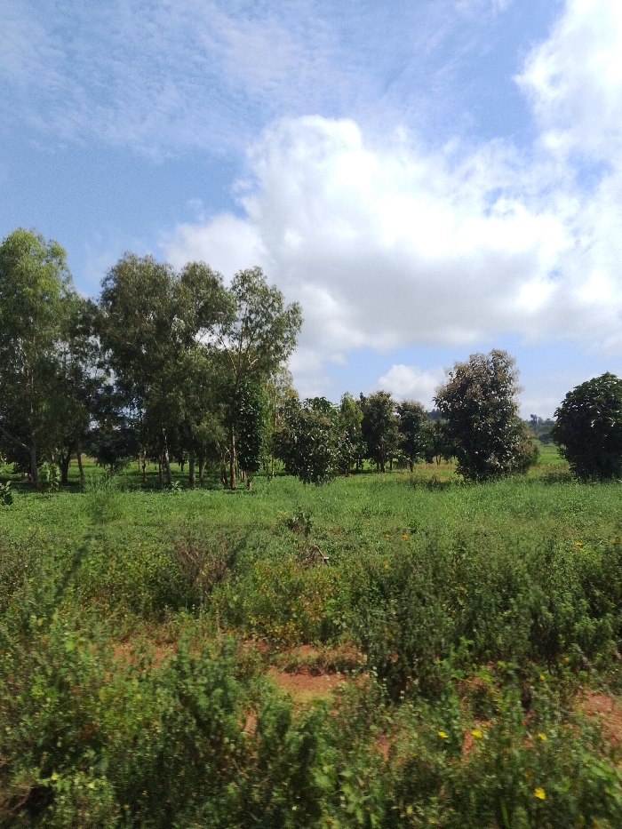 The image depicts a rural or semi-rural landscape located in Sabon Gari Nassarawa, Nigeria. The scene is dominated by natural vegetation under a partly cloudy sky. The upper portion of the frame features a light blue sky with scattered white cumulus clouds, indicating fair weather conditions. The horizon line is obscured by dense tree lines and lower vegetation. The midground and foreground consist of an expansive field of lush green foliage, primarily comprising various types of herbaceous plants and dense shrubs. Irregular patches of reddish-brown soil are visible intermittently between the green growth, particularly in the mid-lower section. Small yellow blossoms are present among the green plants in the lower right quadrant. A dense aggregation of trees forms the background, extending across the entire width of the image. These trees vary in height and canopy density, displaying shades of dark green and some lighter green foliage. No individuals, animals, or man-made structures are discernible within the frame.