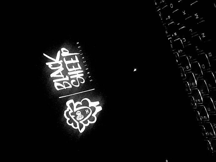 The scene, located in the city of Unknown, Unknown, depicts an open laptop presented in a high-contrast, stark black and white photographic style. The laptop's screen, set against a dark background, displays a white logo for 'BLACK SHEEP SYNDICATION', featuring a stylized sheep's head icon to the left of a vertical separator line, followed by the text 'BLACK SHEEP' in a bold, textured font and 'SYNDICATION' in a smaller, simpler font. A white arrow-shaped mouse cursor is visible on the screen. The lower part of the image shows a section of the laptop's keyboard, with black keycaps and white character outlines, clearly showing keys from the QWERTY layout, including numbers and various alphabetical characters. No individuals or active interactions are visible.