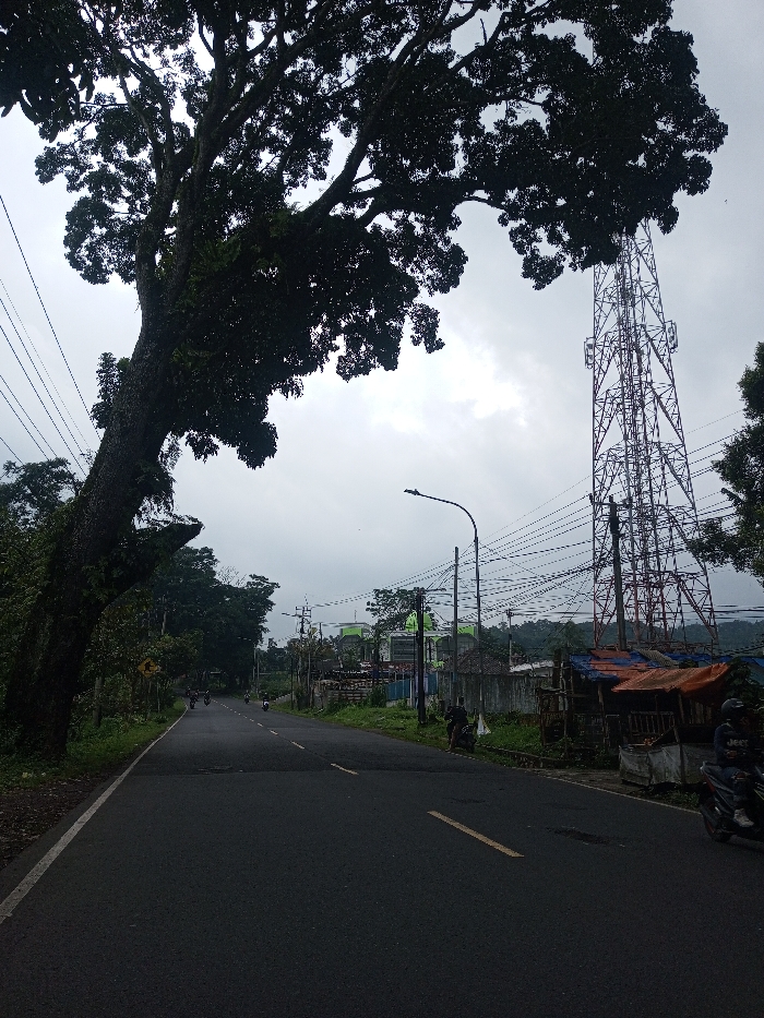 The image presents a street scene in Sandamal Eliya, Sri Lanka, captured under an overcast sky. A dark asphalt road, marked with a solid white line on the left and broken yellow lines in the center, extends into the distance, curving slightly to the right. On the left side of the frame, a large tree with a thick, textured trunk and dense, dark foliage dominates the upper and left portions, silhouetted against the sky. Multiple utility lines are visible crossing the frame horizontally above the road. Further down the road on the left, a yellow triangular road sign is partially obscured by foliage. On the far right, a dark-colored scooter is parked or stopped, with a person wearing a helmet seated on it. Adjacent to the road, two makeshift stalls are present, constructed with wooden frames and covered by tarpaulin sheets, one orange and one blue/brown. Immediately behind these stalls and a utility pole, a tall, red-painted lattice communication tower stands prominently, rising high into the sky with multiple antenna platforms. A modern street light, featuring a curved pole and a rectangular fixture, is also visible on the right side of the road. In the mid-distance, several additional individuals are seen riding scooters or motorcycles along the road. Beyond the immediate roadside structures on the right, a distinctive building with a light green domed roof and white walls is visible. Distant hills or mountains are discernible on the horizon beneath the uniformly grey, cloudy sky.