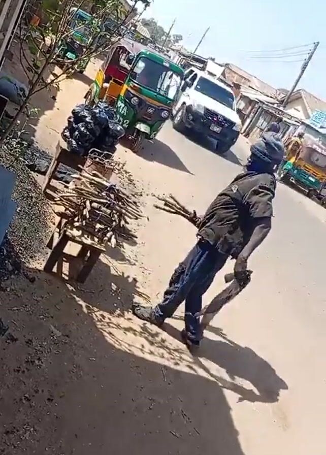 The video depicts a scene on a sunny day on a street with various vehicles, including "keke napep" (three-wheeled vehicles), a pickup truck, and other cars. A man in a black shirt, jeans, and a black hat is standing next to a cart filled with firewood and black trash bags. He is holding something in his hand and gesturing towards the cart. Another person in a plaid shirt walks behind him on the street. The background includes buildings and vegetation, indicating a populated area. The camera appears to be handheld and static.