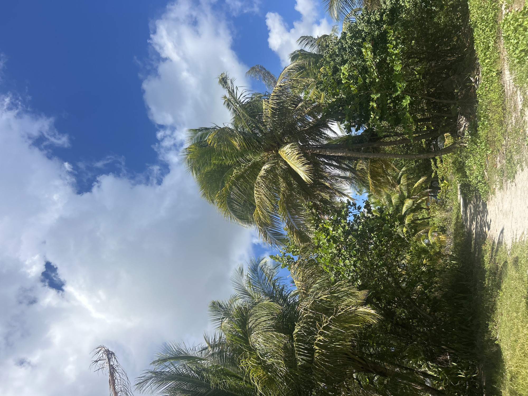 view of palm trees and other lush greenery under a partially cloudy sky, with the ground and a narrow path visible on the right