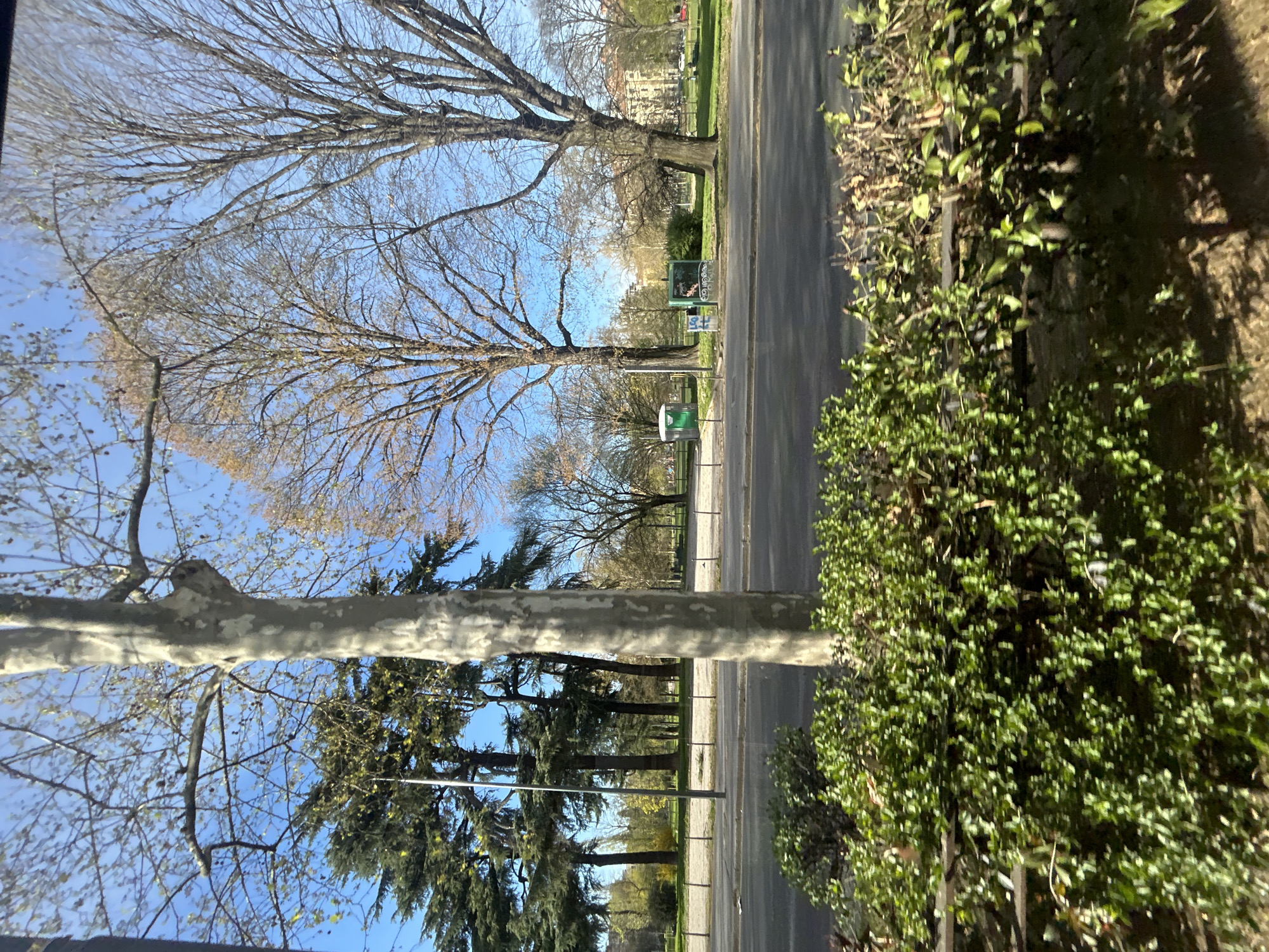 The scene depicts an outdoor urban park environment in Milan, Italy, specifically an area bordering the Giardini Pubblici Indro Montanelli, viewed across a city street. The perspective is from a slightly elevated position, possibly from a vehicle or a higher sidewalk, looking towards the park under a clear blue sky. In the immediate foreground, out of focus, a dense, dark green hedge with small leaves is visible, extending across the lower portion of the frame, partially obscuring a dark horizontal railing or fence. Beyond this, a dark asphalt road occupies the mid-ground, featuring a light-colored curb delineating its edge from the park. A series of short, dark bollards or posts with a thin, light-colored barrier (possibly wire or chain) forms the boundary of the park. A large, prominent plane tree with mottled light grey and brown bark stands centrally, partially obstructing the view of the park. Its branches, mostly bare or with very sparse foliage, extend upwards. To the left of this tree, a tall, slender dark grey street light pole is present. The background primarily consists of the urban park. On the left, a dense cluster of tall, dark green coniferous trees (pines or cedars) is visible. Further into the park, numerous tall deciduous trees stand, predominantly bare or displaying early spring foliage with light brown and yellow leaves. In the central-right area of the park, a green portable toilet and a lower-standing green utility box or information stand with white and blue graffiti markings on its base are discernible. Beyond the treeline, in the distant background, multi-story buildings with light-colored, possibly beige or reddish-brown facades, typical of Milanese architecture, are visible. A faint red vehicle is also present in the far distance on a parallel road. The sky is clear and bright blue, visible between the tree branches. No individuals or active subjects are present in the scene. The lighting indicates strong natural sunlight, creating distinct shadows, suggesting a clear day, likely late winter or early spring.
