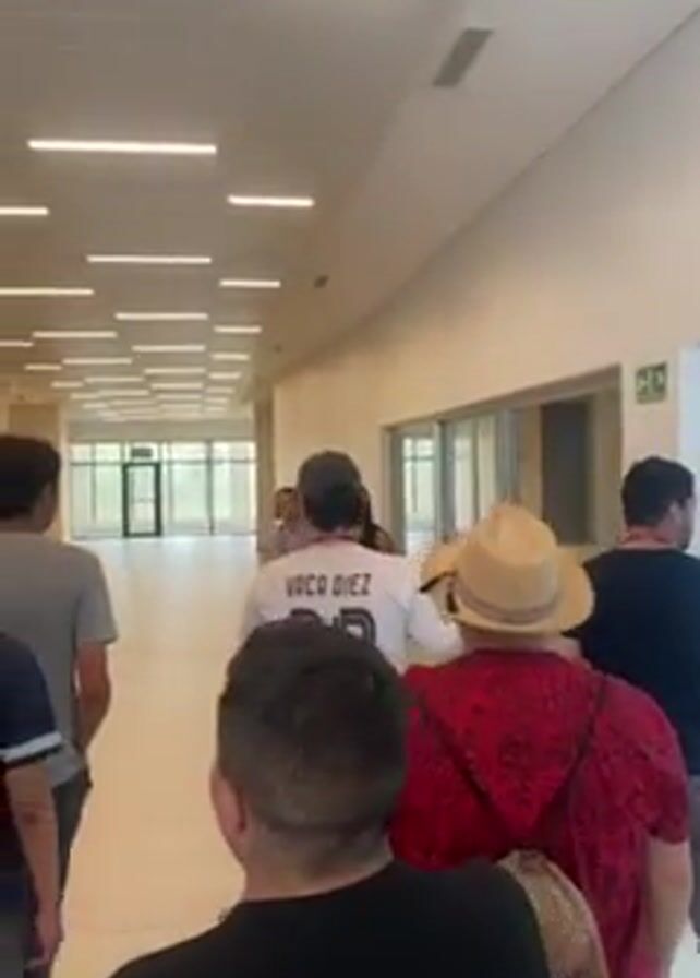 A group of people walks down a well-lit hallway. The walls are white, and the ceiling has long, rectangular light fixtures. Most of the people are facing away from the camera, with their backs visible. One person wears a white soccer jersey with the name "VACA DIEZ 33" on the back. Another person wears a straw hat. The group is walking towards a person in the distance. There are window panes on the right wall. A large sign is on the left wall.