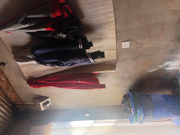 A pile of clothes rests on a mat on a gray floor, including red, gray, and blue garments. A white electrical outlet is on the adjacent floor. A red garment lies partially on the floor. A blue plastic laundry basket filled with clothes sits nearby. A light source brightens the bottom of the image. The corner shows corrugated metal siding.