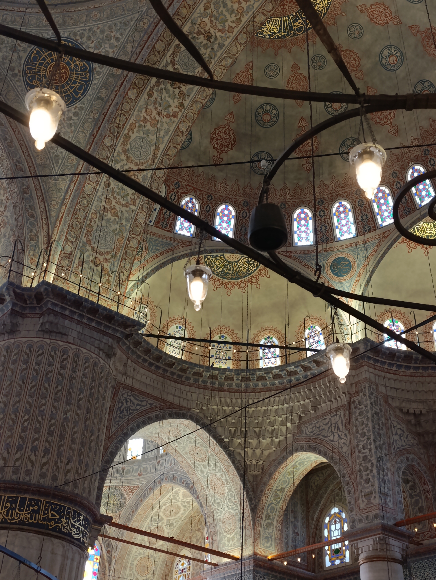 interior of a mosque, specifically the Blue Mosque (Sultan Ahmed Mosque) in Istanbul, Turkey. The view is directed upwards, showcasing the dome and arches. The dome is decorated with intricate patterns and Islamic calligraphy in blues, reds, and gold. Stained glass windows encircle the base of the dome. A network of black metal rods supports a system of hanging lamps. The walls and arches are also adorned with detailed designs. The architecture reflects Ottoman Islamic design principles. There are no people visible in the image.