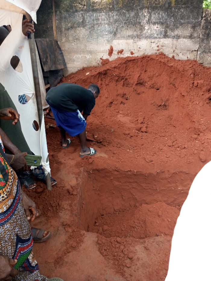 The scene is set in Oko Town, Nigeria. A male subject is observed actively digging a rectangular pit in reddish-brown soil. He wears a black t-shirt, blue shorts, and white-and-black striped slides, bending forward over the excavation. A substantial mound of excavated reddish-brown earth is piled directly behind him, against a weathered grey concrete block wall. To the left, several individuals are partially visible, obscured by a torn white fabric tarp supported by poles. One individual's left hand is visible holding a dark green smartphone, while another's lower body shows a colorful patterned fabric garment. The ground surface consists entirely of reddish-brown earth.