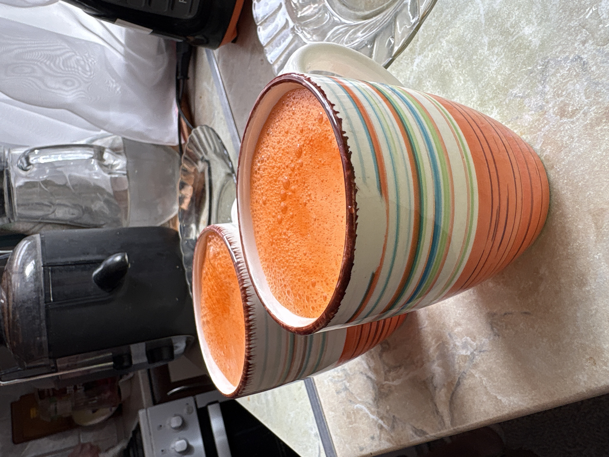 The scene takes place in a residential kitchen in Ulyanovsk, Russia. Two ceramic mugs filled with a bright orange, frothy beverage are positioned on a mottled beige countertop. The mugs are decorated with horizontal stripes in shades of orange, red, blue, green, and white, topped by a dark brown rim. In the background on the left, a white kitchen range with two circular control knobs is partially visible next to a dark-colored juicer with a prominent black spout. To the right, a clear glass pitcher partially filled with water stands before a translucent white curtain. A clear glass dish with a ribbed pattern rests on the countertop to the right of the foremost mug, and a section of a dark electrical appliance is visible at the far right edge. No individuals are present in the image.