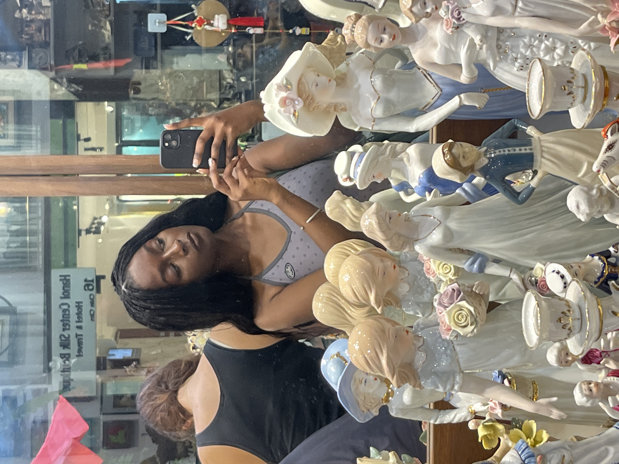 A woman with long dark hair and wearing a tank top is taking a selfie in a display case filled with porcelain figurines of women wearing elegant dresses and hats
