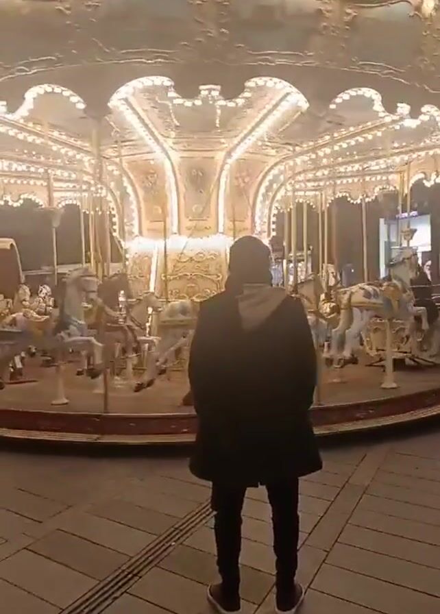 person standing in front of a carousel. The carousel is decorated with horses and carriages, and it has many lights. The person is wearing a dark coat, dark pants, and dark shoes. They are looking at the carousel. The background is blurry, but it looks like it is night time. The ground is paved with tiles.