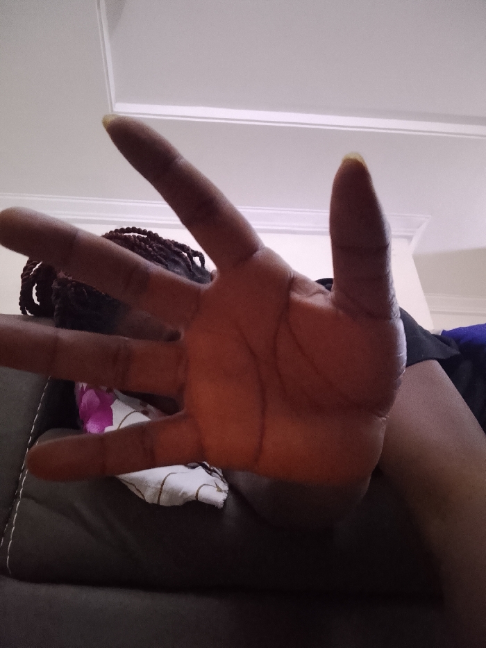 The image depicts a close-up, low-angle view of a person's outstretched, open right hand, palm facing the camera, dominating the foreground. The skin tone of the hand is dark brown. The fingernails, including the thumb, index, middle, ring, and pinky fingers, are visible and appear to have a pale yellow or light discolored tint. Behind and partially obscured by the hand, a person with dark braided hair is visible. The person appears to be seated or reclining on a dark brown upholstered surface, possibly a sofa, with visible white stitching on the left side. A piece of fabric with a white background and a purple floral pattern is present on the upholstered surface, partially beneath the hand. The upper background features a white ceiling with simple white crown molding and a white wall section. The lighting is ambient and even. The location is the city of Unknown, Unknown.