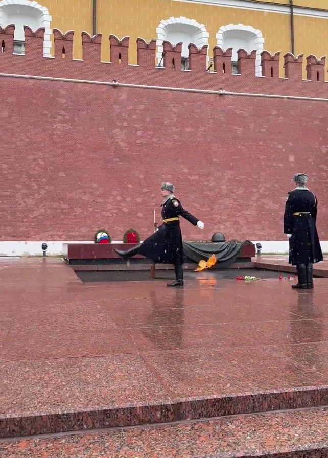 In a medium shot, a guard in a black coat with gold accents, a grey hat, and black boots walks to the left on a shiny red granite surface. Behind him, another guard stands at attention within a small golden archway. Snow is falling lightly. In the background is a red brick wall, a low monument with wreaths, flowers, a helmet, and a lit flame. The red granite platform is accessed by stairs with red granite treads and risers.
