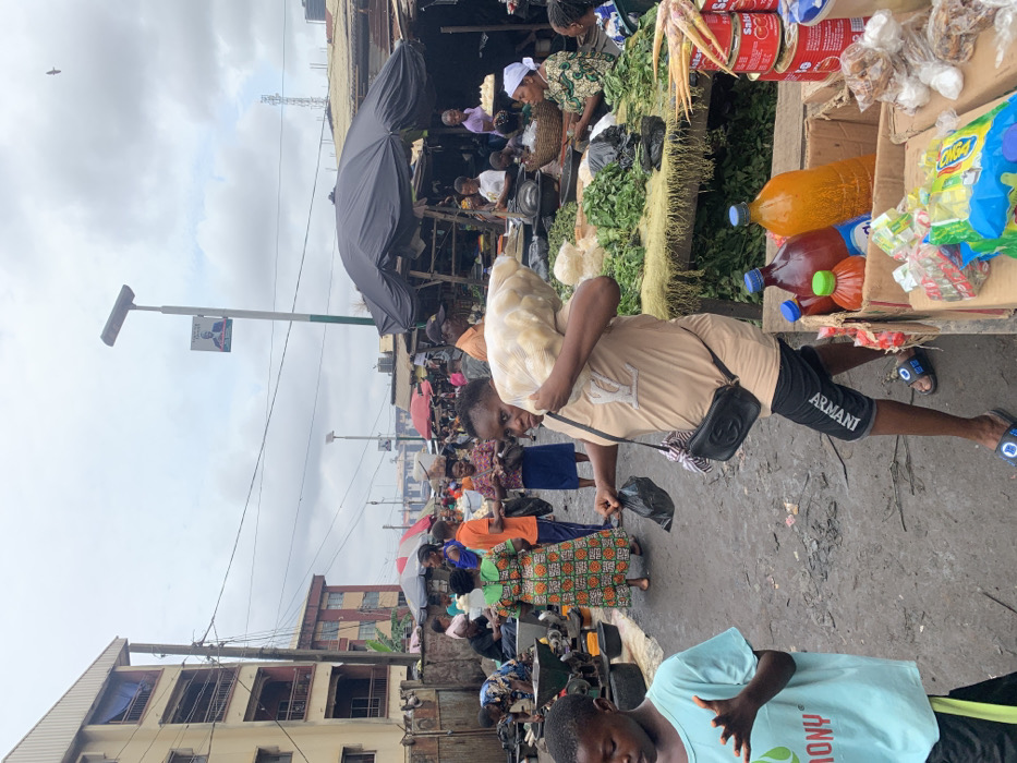 The image depicts an active outdoor market scene in Nkpor, Nigeria, under an overcast sky