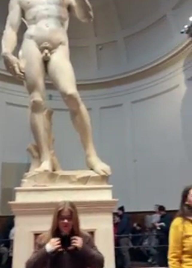 two young women standing in front of the statue of David by Michelangelo