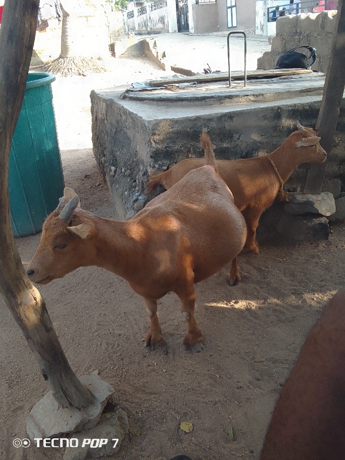 Two brown goats stand in a dirt enclosure beside a concrete structure. One goat, appearing pregnant, is in the foreground near a wooden post. The second goat is smaller and has a rope tied around its neck. In the background, there's a green trash bin, a building, and some foliage. The sunlight creates shadows across the scene. The picture also has a 'TECNO POP 7' watermark on the lower left.