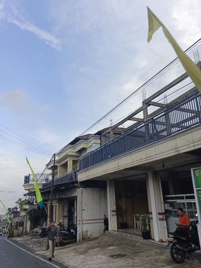 The image depicts an urban street scene under a partly cloudy sky. The requested location is Mate Yehuda Regional Council, Israel. However, a prominent green sign on the far right displays text in a script consistent with Southeast Asian languages (e.g., Indonesian or Malay), which is inconsistent with the specified location. In the foreground, a paved road or shoulder occupies the lower left. A male subject, wearing a grey long-sleeved shirt and light-colored trousers, walks towards the left, holding a dark object to his left ear, appearing to be on a phone call. Behind him, a blue and white motorcycle is parked on the unpaved ground next to a building. The right side of the image features a multi-story building. The ground floor contains open commercial spaces. One such space, towards the center-right, reveals white tables, chairs, and potted plants, suggesting an eatery. A male subject in a black shirt is partially visible standing within a doorway further left on the ground floor. On the far right, a male subject wearing an orange short-sleeved shirt is seated on a dark motorcycle, looking at a mobile phone. The aforementioned green sign with white text is visible near him. The upper floors of the main building feature balconies with dark, vertical railings. The architecture includes pillars and decorative cornices. The topmost section of the building on the far right appears to be under construction, with exposed concrete beams and vertical rebar elements visible against the sky. Electrical power lines are strung across the scene, connected to poles. Multiple yellow or lime green flags/banners are visible, attached to poles, one prominently in the upper right corner, another on the left side of the street further back. The overall lighting suggests daytime conditions.