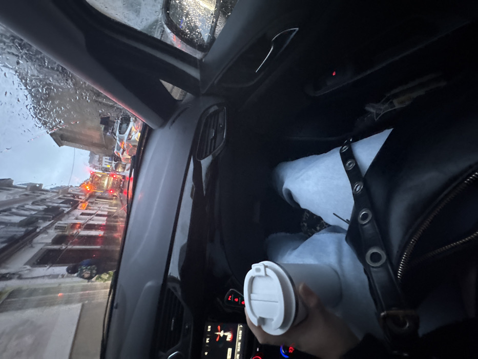 An interior car view shows a rainy city street through the front windshield. The focus is inside the vehicle, where a hand holds a closed, white reusable cup. A passenger's lap is visible, draped in a light blue blanket, partially covered by a black purse with circular metal accents on its strap. The dashboard's infotainment system glows with data, while the rearview mirror catches blurred city reflections.