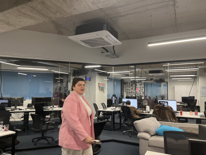 The image displays a modern, open-plan office interior located in Tbilisi, Georgia. In the foreground, a female subject with dark hair and light skin is captured in motion, moving from left to right. She is attired in a light pink blazer over a white turtleneck and light-colored pants. Her mouth is open, indicative of speaking or vocalizing, and her right hand holds a small, reflective metallic object. Behind a clear glass partition, an active office environment is visible. This area contains multiple white desks, each equipped with a black office chair, at least one computer monitor, and standard office peripherals. Several individuals are seated at these workstations, engaged with their computers. One person, wearing a brown jacket, is clearly visible seated at a desk on the right side of the partitioned space. A wall adorned with a grid of black and white photographs is visible in the background, along with white storage cabinets on the far right. The ceiling above the foreground area features exposed concrete with visible conduit and ductwork, along with a large, white, ceiling-mounted HVAC unit. Linear LED light fixtures are present throughout both the foreground and the partitioned office space, providing illumination. In the immediate right foreground, a light-colored sofa with a prominent blue throw pillow is partially visible.