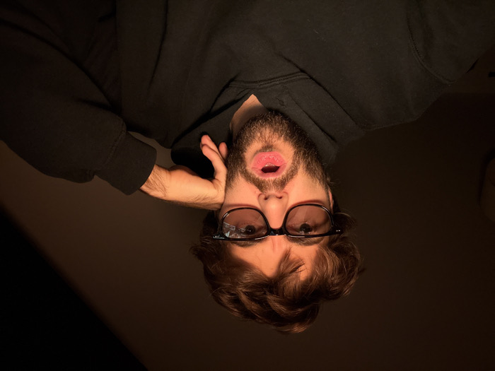 A man with brown hair and a beard wearing glasses is positioned upside down against a dark brown background. He has his hand near his face. He is wearing a black hoodie. His mouth is open, as if surprised or speaking. The lighting is dim and casts shadows on the wall.