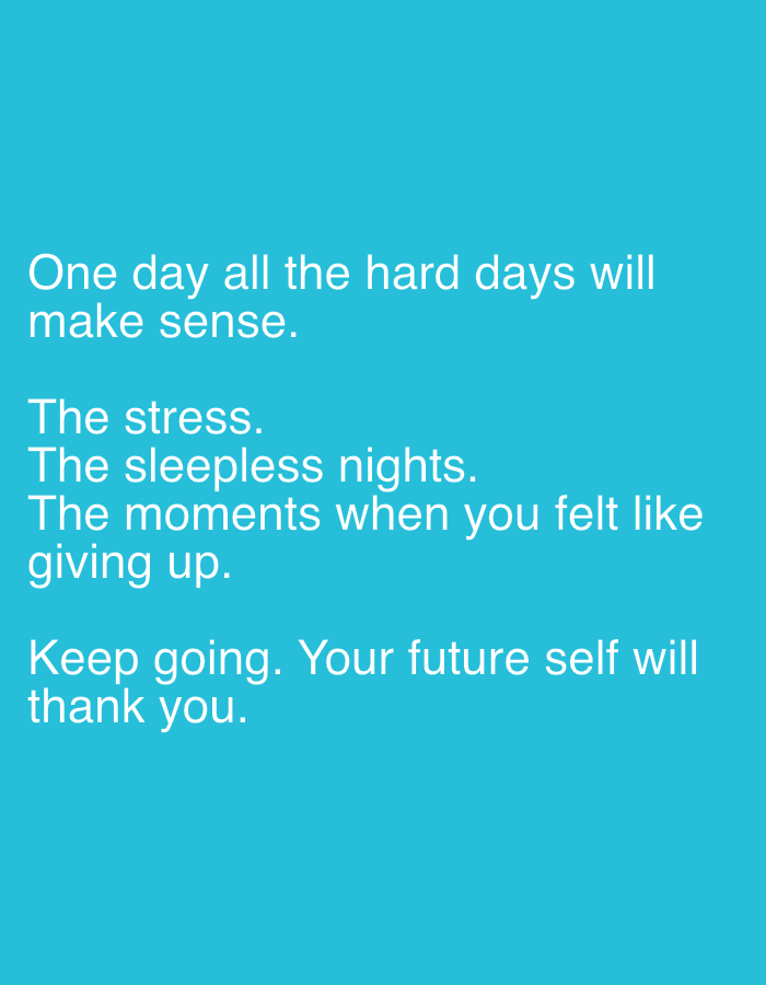 The image displays white text on a solid teal background. The text reads: "One day all the hard days will make sense. The stress. The sleepless nights. The moments when you felt like giving up. Keep going. Your future self will thank you." No people, physical subjects, or objects are depicted. No actions or interactions are present. The environment is a digital graphic with a uniform background color. The image provides no visual information to indicate a specific geographic location, including any part of Preston, United Kingdom.