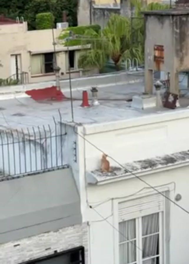 n outdoor scene of buildings, roofs, and vegetation. An orange cat is sitting on the edge of a roof. The buildings vary in height and color, with a mix of white, gray, and brown tones. Some roofs are flat, while others have visible structures on them like antennas and chimneys. Green trees are visible in the background, adding to the urban environment. The buildings appear to be residential with windows and balconies.