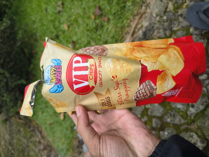 A person holds an opened bag of Happy Island VIP Chips Crunchy Snack in their hand outdoors. The bag is mostly tan with red accents, featuring images of potato chips and grilled meat. The flavor is “Rasa Sapi Panggang,” which translates to grilled beef flavor. A lawn and part of a flip-flop are visible in the background.