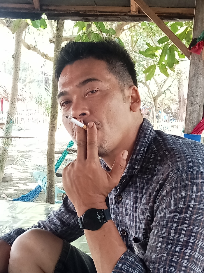 An individual, identified as an adult male of Southeast Asian appearance, is depicted seated outdoors in Reudeuep, Indonesia