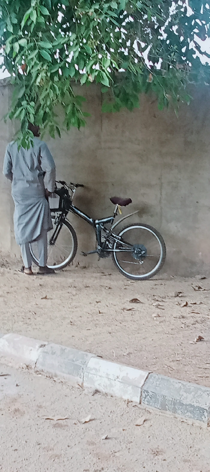 - "A man in a grey salwar kameez stands next to a black bicycle against a light tan wall" by FM-gYzzh1, licensed under CC BY 4.0