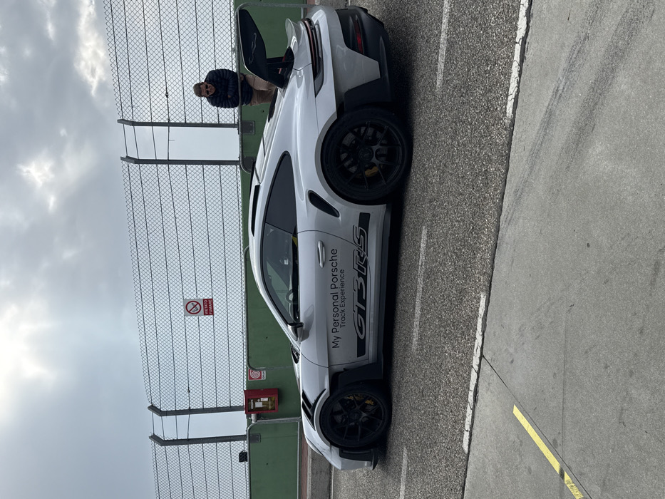 A silver Porsche 911 GT3 RS, adorned with "My Personal Porsche Track Experience" and "GT3 RS" decals, is stationary on an asphalt surface