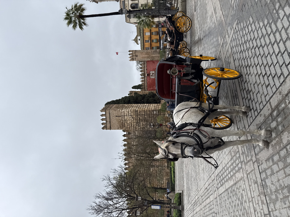 An outdoor scene in Seville, Spain, depicts a dapple grey horse harnessed to a black and red four-wheeled carriage with yellow wheels, stationary on a cobblestone plaza