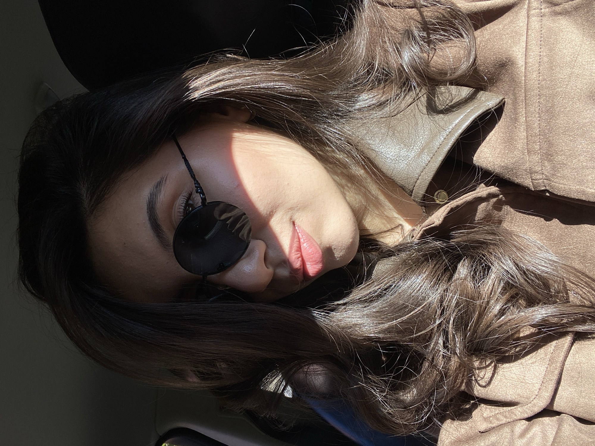 The image displays a close-up, chest-up portrait of a female subject seated inside a vehicle, located in Björklinge, Sweden. The subject has dark, wavy hair and wears round, dark-tinted sunglasses with thin frames. Her lips are colored with a light pink hue. She is dressed in a brown, textured jacket, featuring a contrasting darker brown, textured collar. A brass-toned snap button is visible on the jacket's left front panel. Strong, direct sunlight illuminates the subject from the right, creating distinct highlights on her right cheek, hair, and the jacket, while casting deep shadows across the left side of her face and the blurred, dark vehicle interior background.