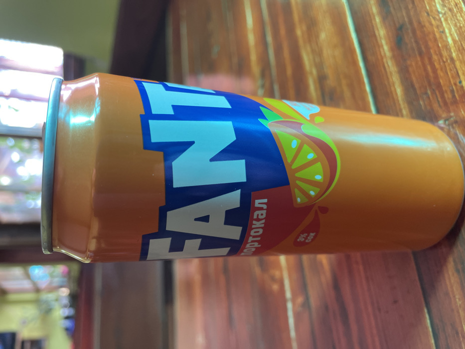- "A single, unopened Fanta brand beverage can, predominantly bright orange with a blue and white label, rests vertically on a horizontal wooden surface featuring a distinct grain pattern" by FM-EVf862, licensed under CC BY 4.0