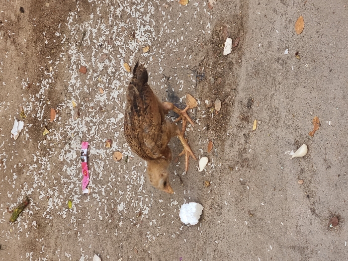 - "A juvenile chicken, light brown with darker brown markings on its wings and tail, forages on a dirt ground in Mamillakunta, India" by FM-Qmj6l1, licensed under CC BY 4.0