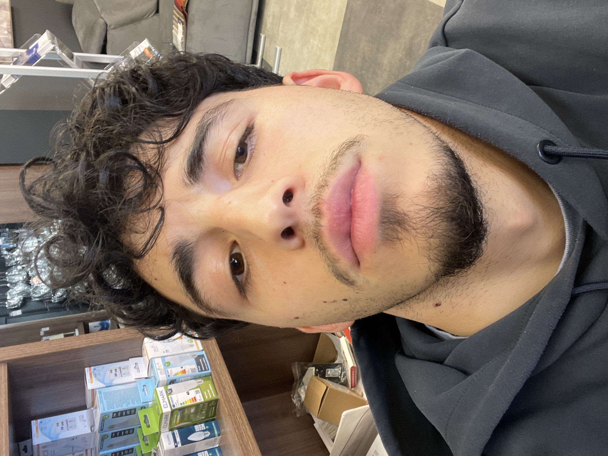 A close-up self-portrait depicts a male individual, approximately 18-25 years old, with dark, curly hair, a short beard, and a mustache. He has dark brown eyes and is wearing a dark grey hooded sweatshirt. A small mole or blemish is visible on his lower left jawline. The subject is centered and looks directly at the camera. The background indicates an indoor retail environment, likely an electrical supply or hardware store in Sofia, Bulgaria. To the subject's left, a wooden shelving unit displays multiple boxed light bulbs and electrical components, with "ELMARK ENERGY" branding visible on some packaging. To the subject's right, a metallic display rack with reflective items is partially visible, followed by a section of a grey upholstered sofa and a light-colored floor.