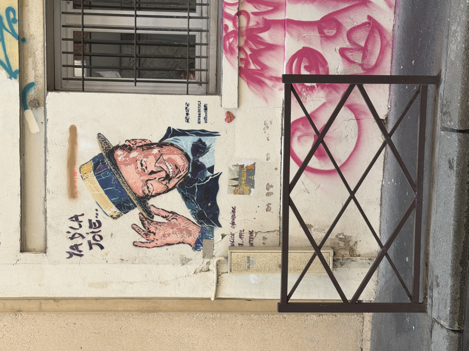 An outdoor scene in Paris, France, depicts a light-colored building facade adorned with street art and various urban elements
