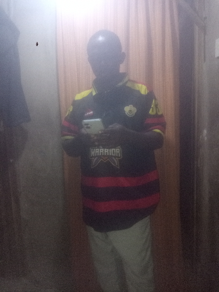 A person stands indoors holding a phone. The individual is wearing a dark shirt with a "Warrior" logo, red horizontal stripes, and yellow accents on the shoulders. The person has on light-colored pants. The room has a wall to the left, a curtain directly behind the person, and a doorway to the right. There is a bright glare above the person's head. A dark object is suspended in the air near the left side of the image.