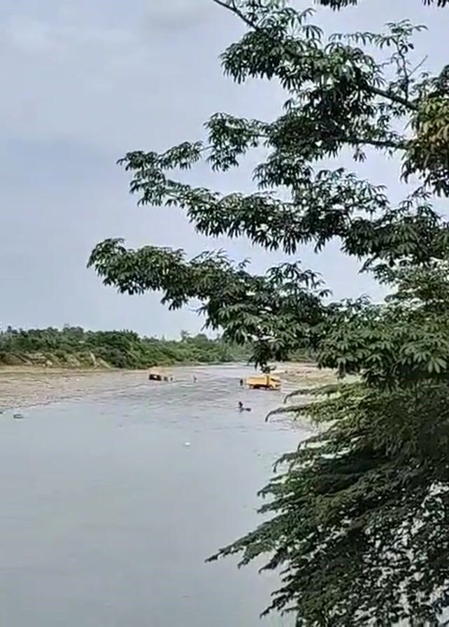 wide, slow-moving river under a cloudy sky. The river banks are covered in light-colored pebbles and some vegetation. In the distance, two yellow trucks are partially submerged in the river. There are people near the trucks, appearing to be working or inspecting them. A tree with green leaves partially obscures the view on the right side of the frame. The camera pans slightly from right to left, showing more of the river bank and the vegetation lining it.