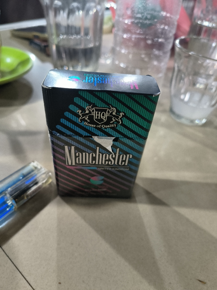 A pack of Manchester cigarettes sits on a flat surface, partially opened with a ripped corner. The pack is black with diagonal stripes in teal and pink. The words "Manchester United Kingdom" are printed in white with pink accents. The upper part of the pack features a heraldic crest with the letters "HQ" and the words "House of Quality." A blue lighter is positioned next to the cigarette pack. In the background, there is glassware including a cup and a water bottle.