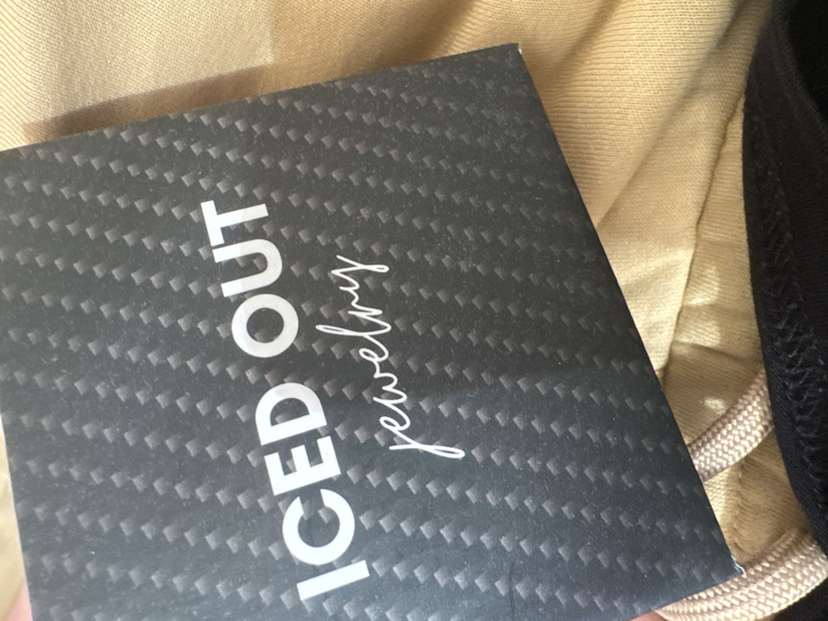 A rectangular product card, predominantly dark grey with a repeating diagonal woven texture resembling carbon fiber, is depicted in a close-up, slightly angled overhead shot. The card features white text: "ICED OUT" in prominent sans-serif capital letters, centered above "jewelry" rendered in a smaller, flowing script typeface. The card rests upon a light brown, possibly tan, soft textile fabric, likely part of a garment. A light-colored drawstring is visible along the lower left edge of the card, situated on the brown fabric. A thin strip of black fabric is visible beneath the brown material at the very bottom edge of the frame. No human subjects, explicit actions, or definitive environmental markers beyond the fabrics are present. The scene is located in the city of Birkova, Bulgaria.