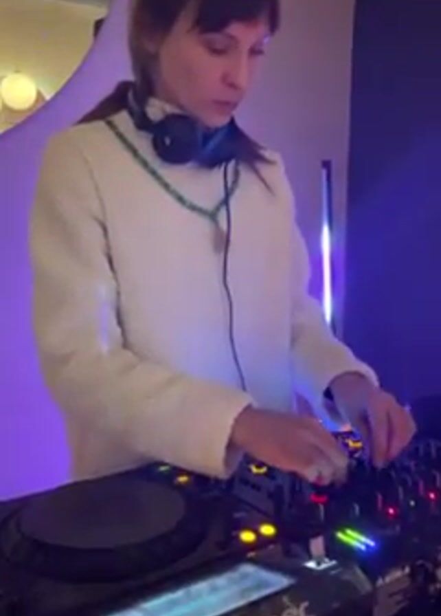 A woman is shown from the waist up while DJing. She has brown hair pulled back in a ponytail with bangs in front. She's wearing a white sweater, a teal beaded necklace and blue headphones around her neck. She's manipulating a large Pioneer DJ mixing board. There are lights and decorations in the background.