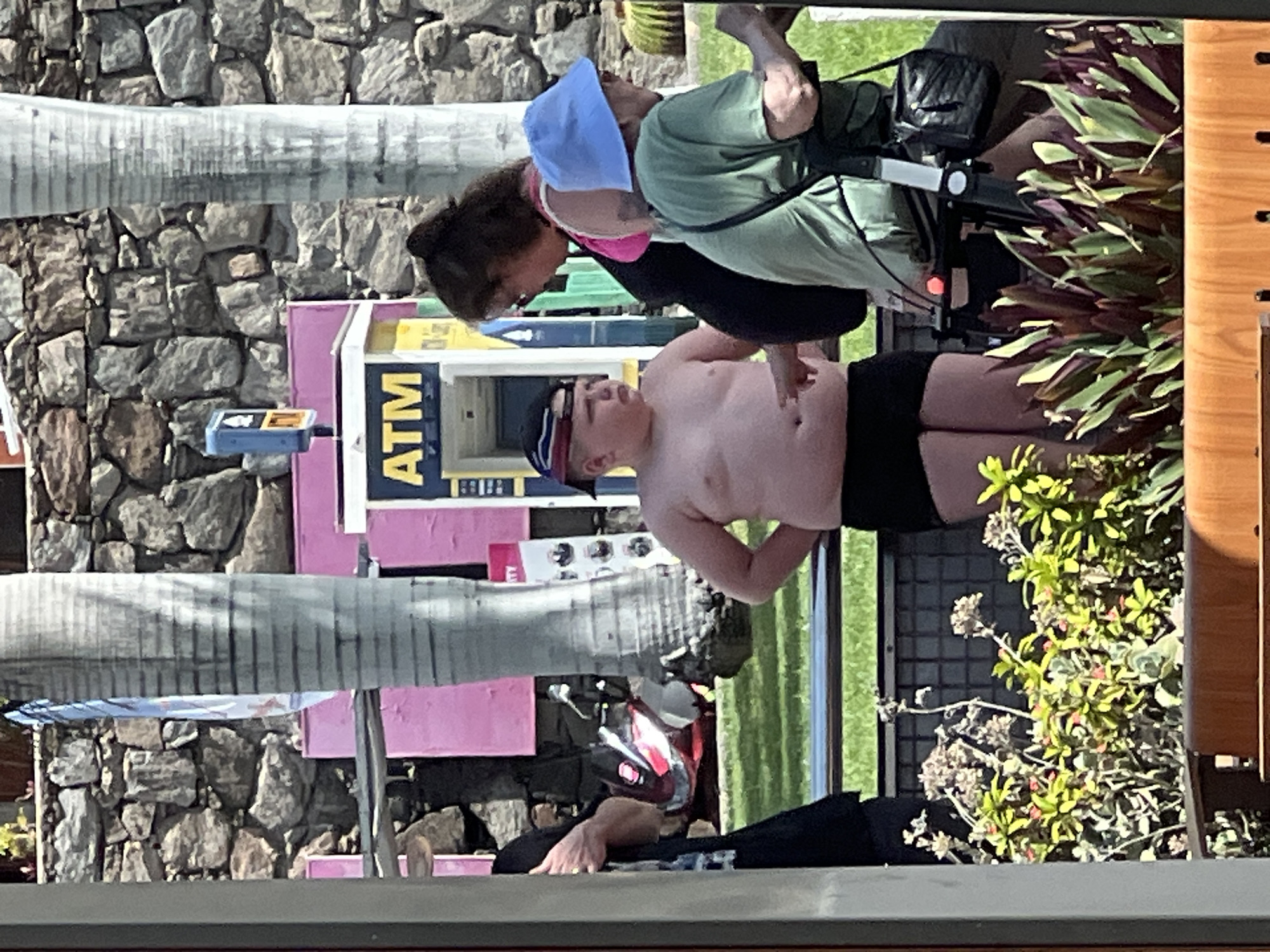 The image depicts an outdoor scene in the city of Puerto Rico, Spain, under bright daylight. In the center-left foreground, a fair-skinned pre-teen boy stands bare-chested, wearing black swim trunks and a multi-colored baseball cap reversed on his head. He has his hands on his hips and appears to be looking towards the left. To his right, an adult female with dark hair pulled back wears a pink top under a dark garment, with sunglasses pushed onto her head and visible tattoos on her left arm. Further right, an older adult is partially visible from the back, wearing a light blue bucket hat, a light green t-shirt, and a black quilted shoulder bag, appearing to lean on a black mobility aid with a visible red light. In the mid-ground, behind the individuals, a white and pink structure with a prominent yellow "ATM" sign is visible. To the left of the ATM, a small blue box is mounted on a pink wall. Two grey palm tree trunks frame the ATM structure. The background is dominated by a rough-hewn stone wall. A patch of green grass lies between the foreground subjects and the ATM. The immediate foreground features a wooden planter containing various green plants, including succulents and broad-leafed varieties. A dark metal railing separates the foreground plants from the grassy area. On the far left, a person wearing a dark shirt is partially obscured by a grey vertical column, with a red object, possibly a stroller, visible behind them.