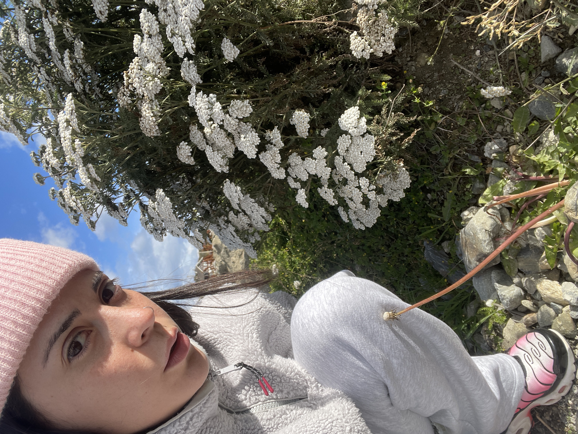 A female individual is depicted in a crouched position outdoors, gazing directly forward into the camera. She wears a light pink knit beanie, a light grey fuzzy quarter-zip pullover jacket with a small red-handled tool attached to the zipper, light grey sweatpants, and white athletic shoes with pink and black accents. Her dark hair is visible below the beanie, and a small silver ring adorns her left nostril. To her right and extending upwards is a dense cluster of white flowering plants, characteristic of Yarrow (Achillea millefolium). The ground beneath her is a mix of small grey and brown rocks, exposed soil, and sparse green vegetation, including a single dandelion stem with a partial seed head near her left leg. In the background, under a blue sky with scattered white clouds, are glimpses of distant buildings or structures on a sloped terrain. The scene is brightly illuminated, indicating daylight. The location is specified as the city of Ushuaia, Argentina.